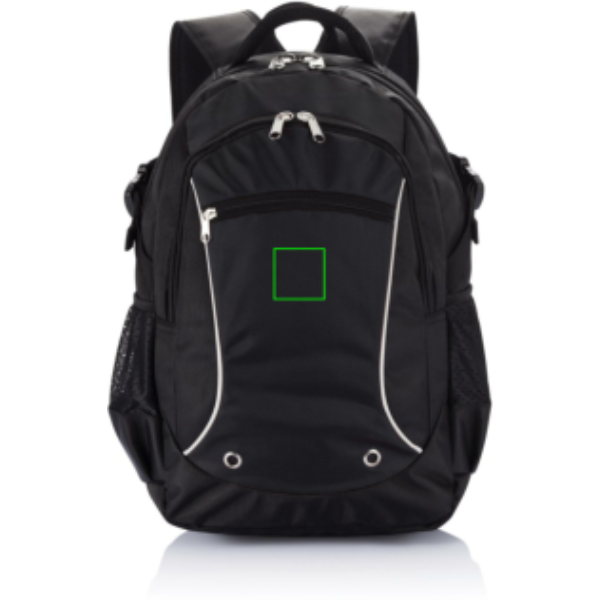 1680D, fack med blixtlås, vadderat laptopfack för upp till 15,4“ med blixtlås. Innefickor samt reflekterande piping.