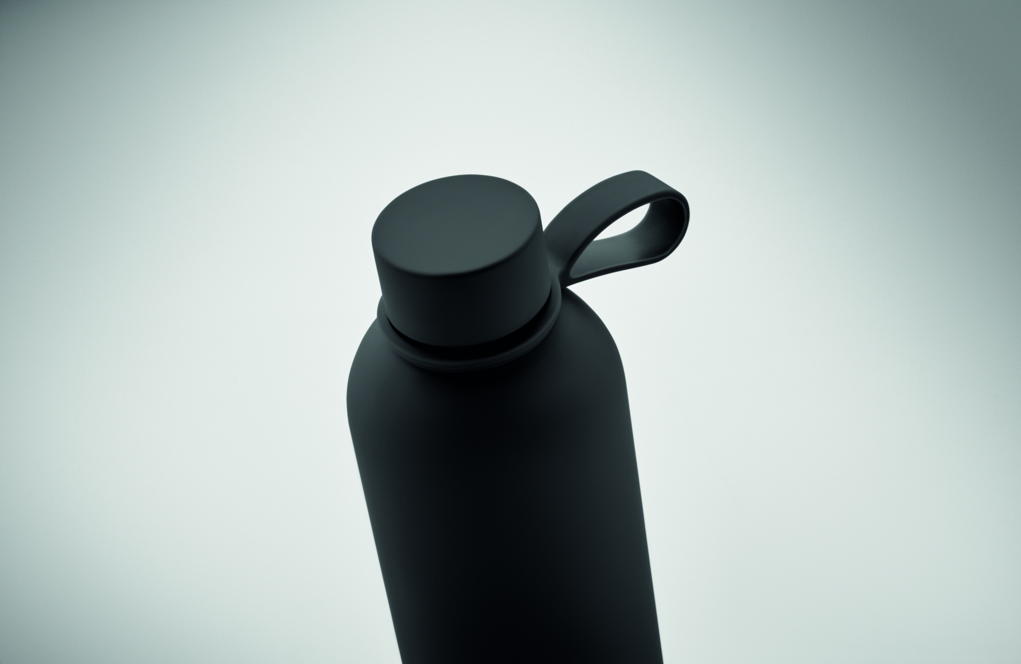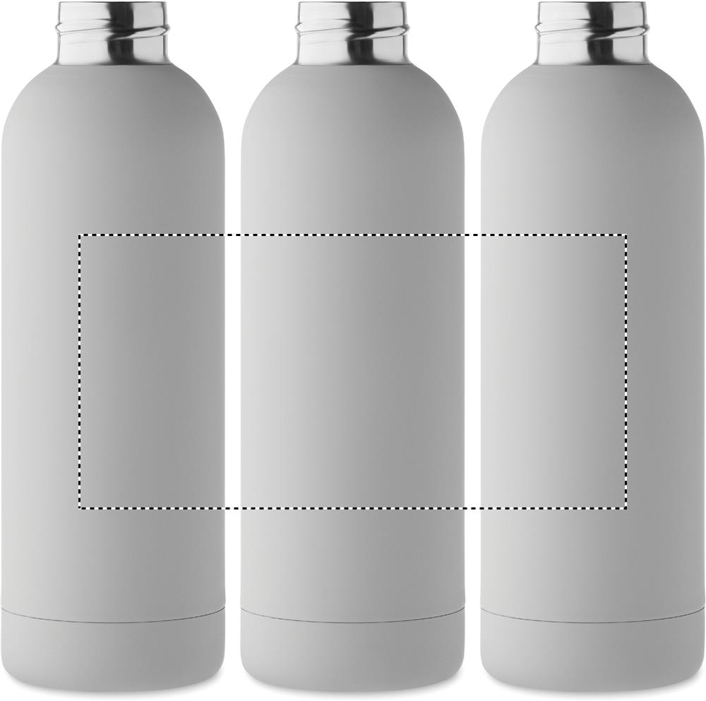 Dubbelväggig vakuumisolerande flaska i återvunnet rostfritt stål (90% återvunnet rostfritt stål och 10% rostfritt stål) med gummifinish och silikonhandtag. Volym: 500 ml.
