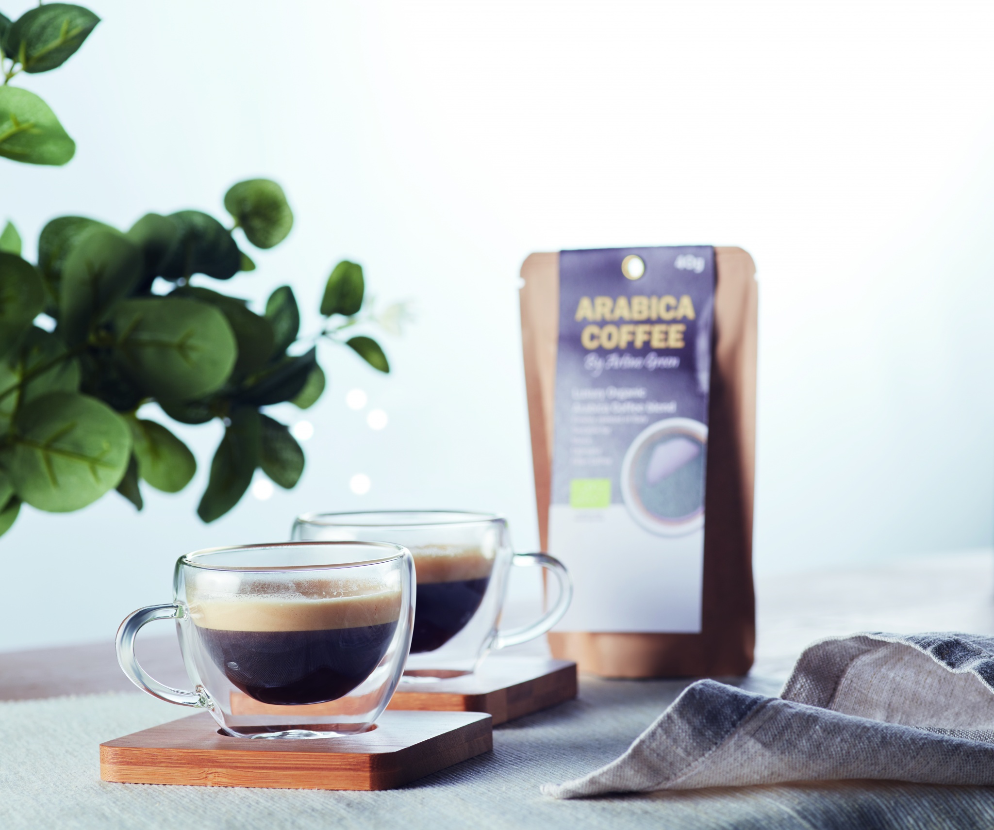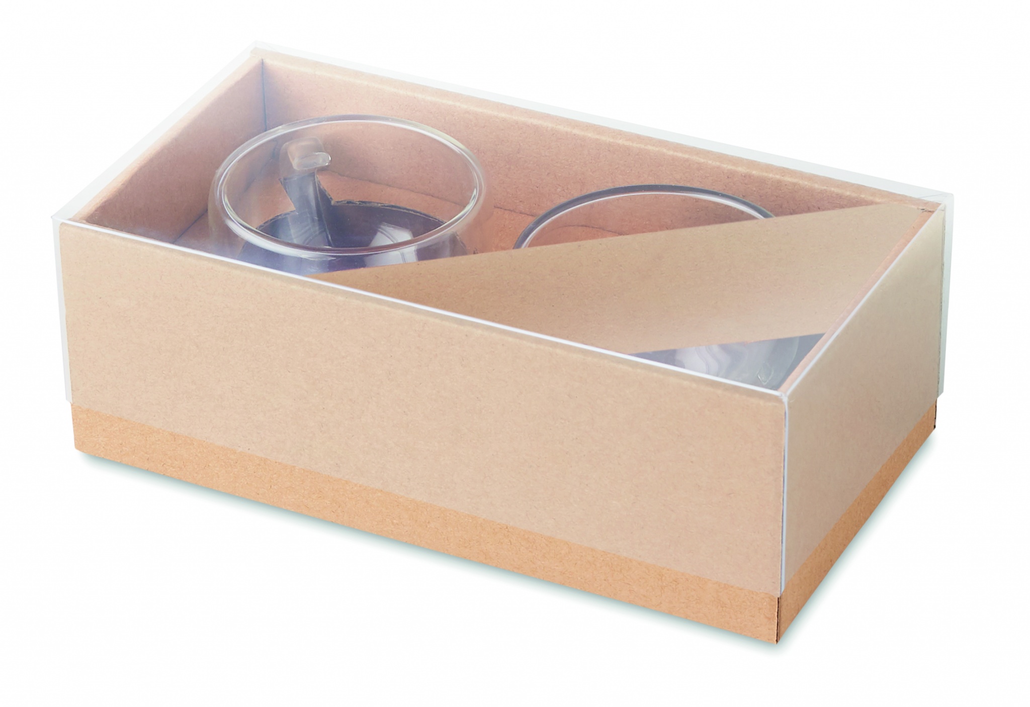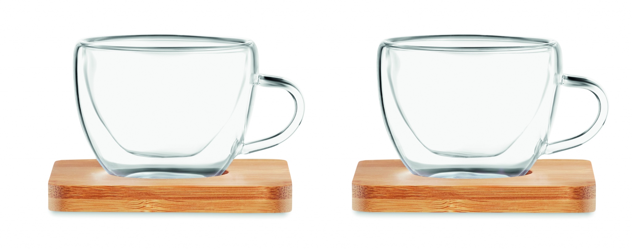 Set med 2 st Espressoglas och underlägg i bambu. Presentförpackning i kraft papper. Muggarnas volym är 60 ml.