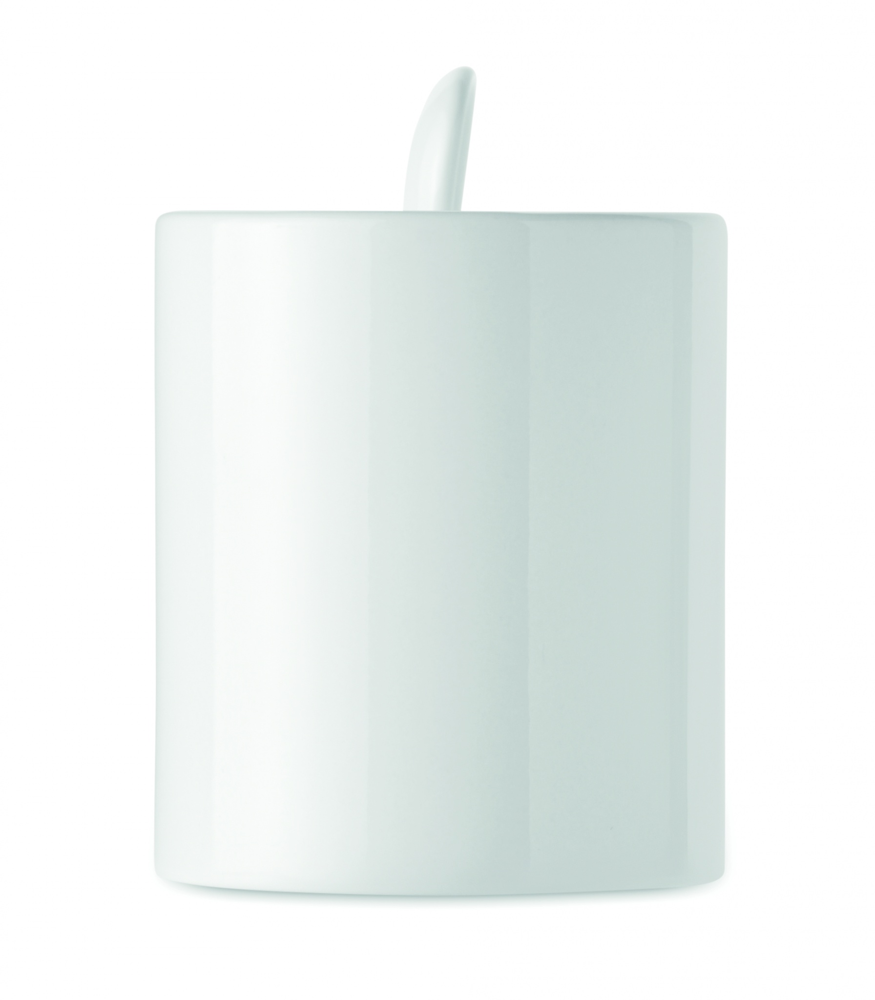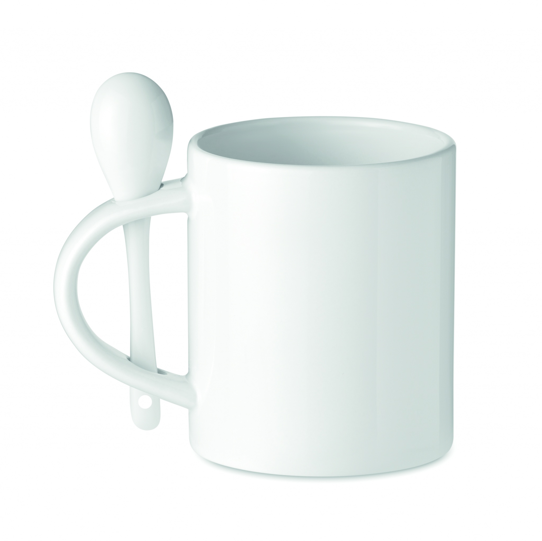 Keramikmugg med sked. Gjord med specialbeläggning för sublimationstryck. Skeden förvaras i handtaget. Kapacitet: 300 ml.