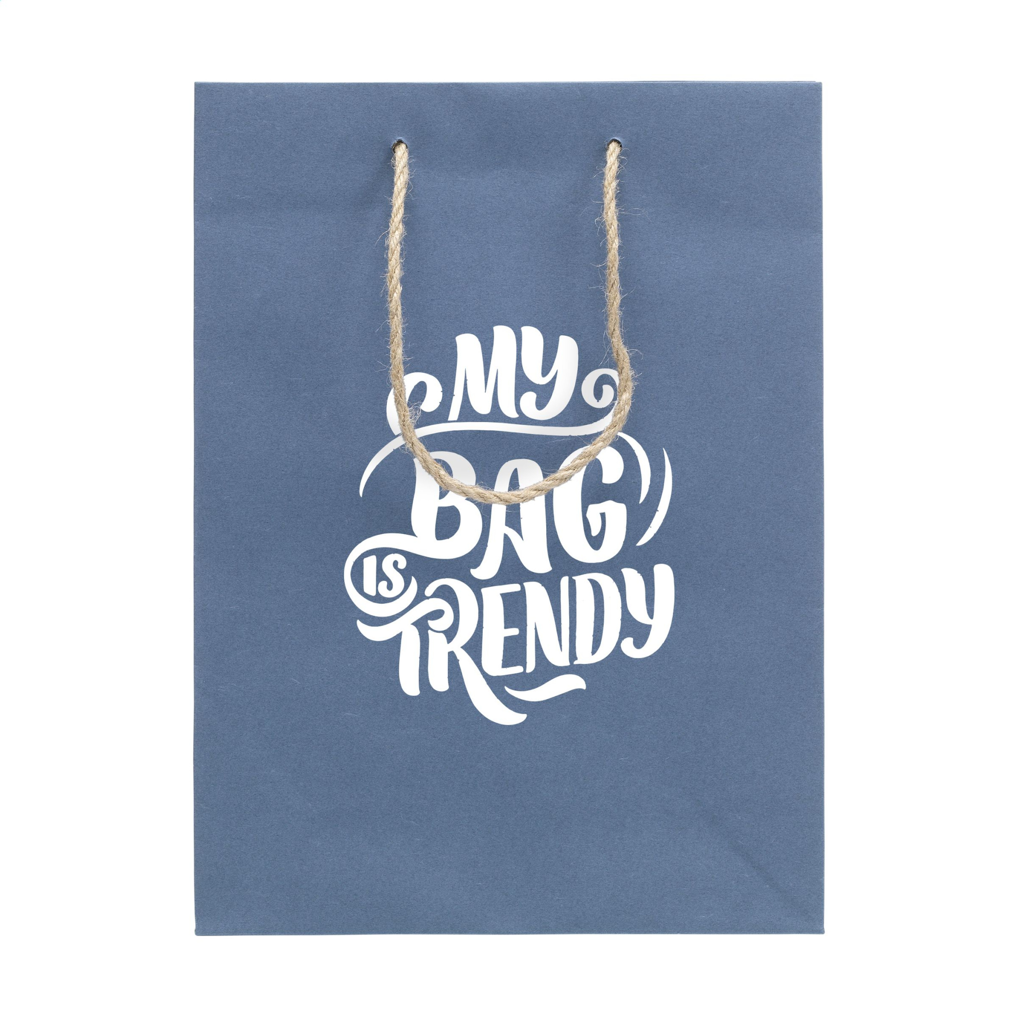 WoW! Stabil ECO-presentpåse (storlek M) gjord av återvunnet papper med jeansfibrer (180 g/m²). På grund av att du använder återvunna jeanstyger kan nyansen av blått skilja sig åt per påse. Den blå färgen ger väskan en trendig look. Väskan har två korta jutebäröglor, en vikt botten och en sidoveck. Lämplig för alla typer av marknadsföringsändamål. Inga träd huggs ner för tillverkningen av denna väska.