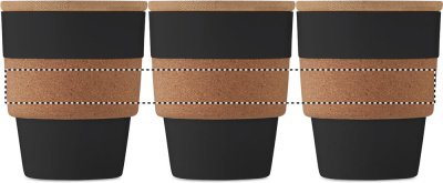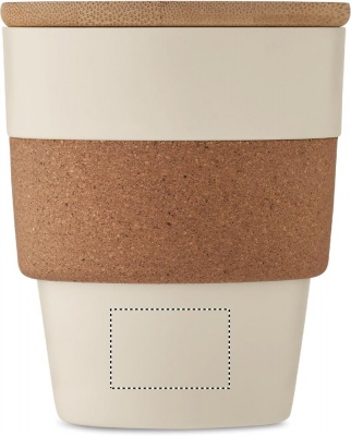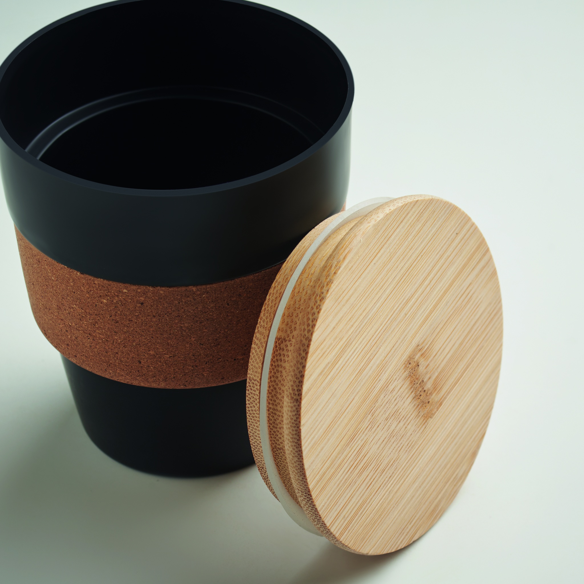 Enkelväggig mugg i återvunnen PP med skyddshylsa av kork och bambulock. Volym: 300 ml. Eftersom detta är en enkelväggig mugg kan värmeöverföring fortfarande förekomma.