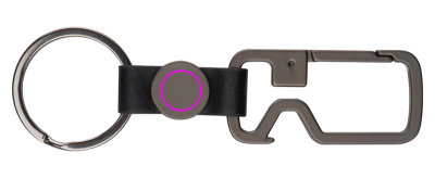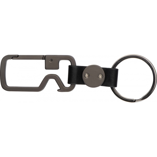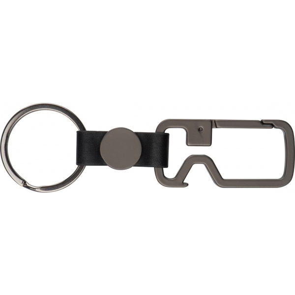 Grafitfärgad nyckelring med karbinhake, nyckelring och flasköppnare. Din logotyp kommer att graveras på den runda biten.