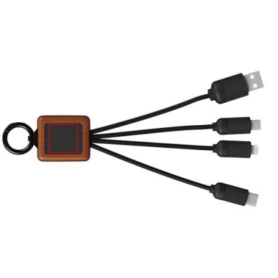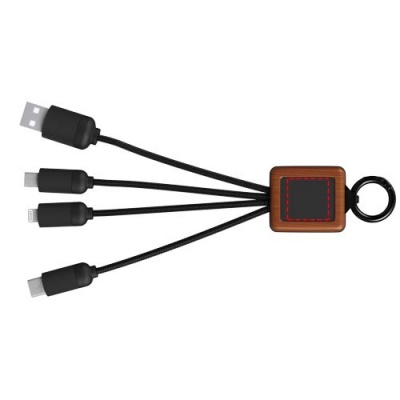 3-i-1-kabel i trä med upplyst logotyp och tre kontakter (type C/mikro-USB/iPhone). Sladdarna är tillverkade av RPET. Kabeln kan ladda upp till tre enheter samtidigt. Patent EUROPE EUIPO.