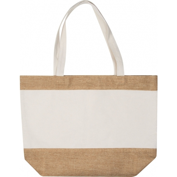 Miljövänlig strandväska av bomull och jute med långa handtag. Allt för din strandresa får plats här. Din logotyp kommer att tryckas på ena sidan.