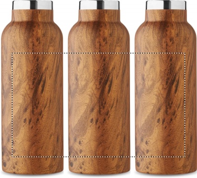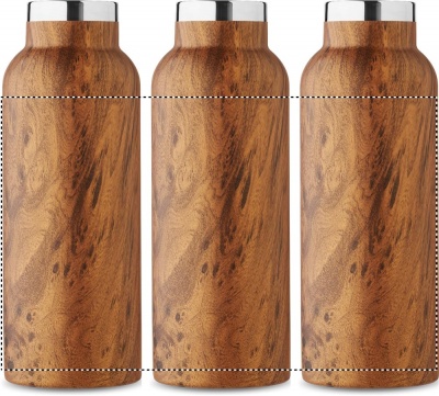 Dubbelväggig isolerande vakuumflaska i återvunnet rostfritt stål (90 % återvunnet rostfritt stål och 10 % rostfritt stål) med träutseende och lock med bärhandtag. Läcker inte. Volym: 500 ml.