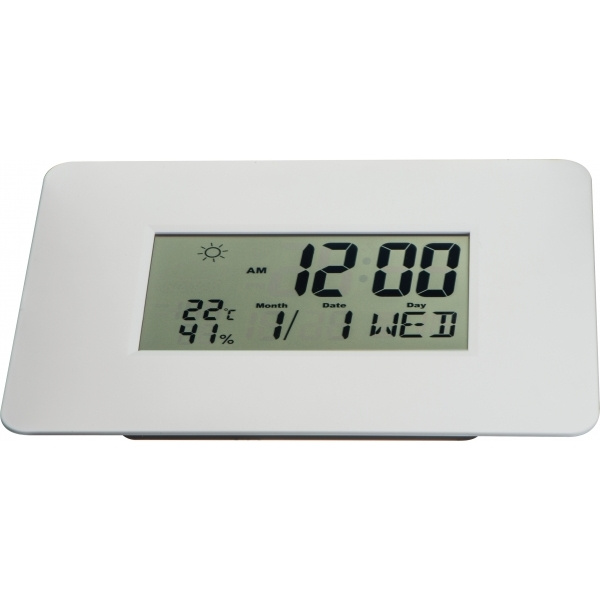 Digital väggklocka med kalender, alarm och snooze-funktion, termometer och hygrometer (automatisk uppdatering av värdena var 20:e sekund) och väderdisplay. Exklusiva 2 AAA-batterier, beställ dessa samtidigt (varunummer 999400). temperatur mätt i F eller C Inställning av cykeln till 12 timmar (AM 12:00) eller 24 timmar (0:00) detekterar temperatur från -50 till 70 Cdetekterar hydrering från 20 till 89 %visar 3 väderlägen: soligt, molnigt, regnigt