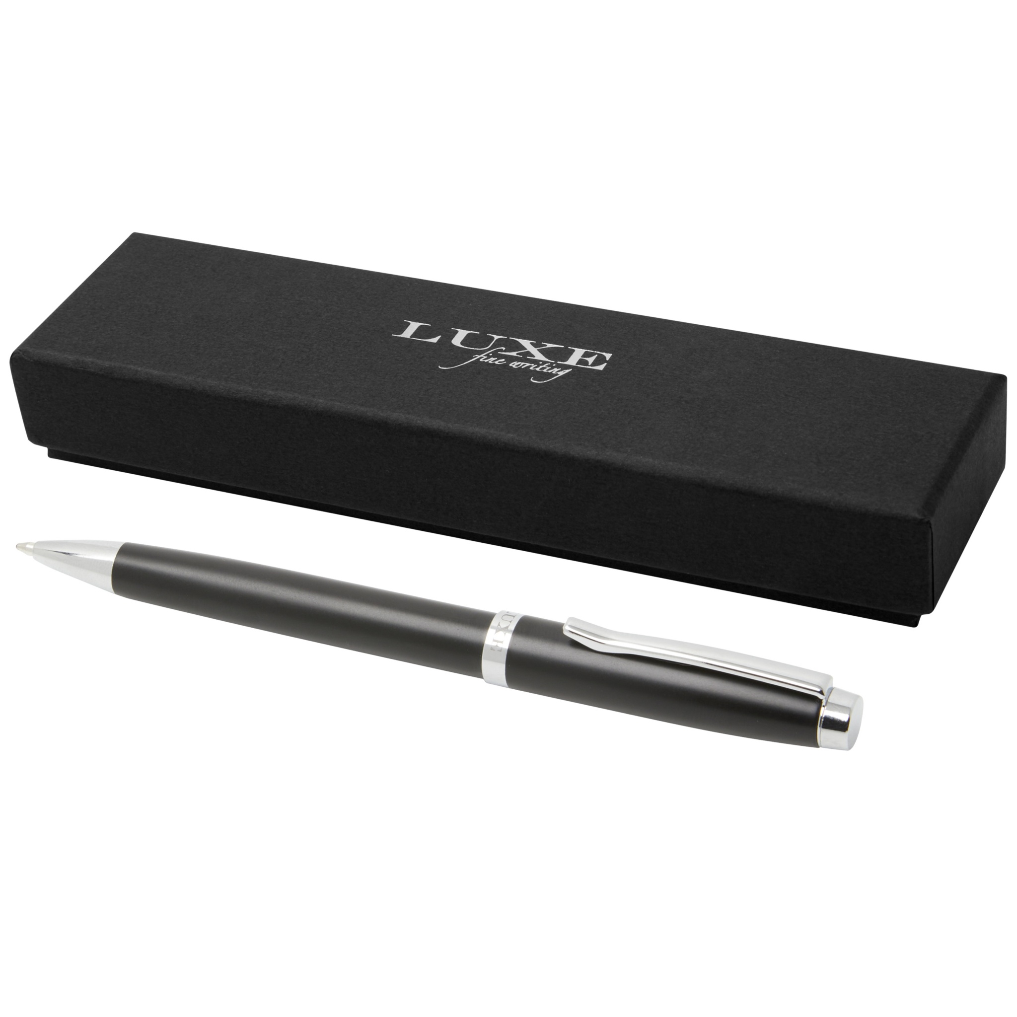 Elegant kulspetspenna med exklusiv design i tre färger. Förladdad med en refill med blått bläck och förpackad i en "LUXE" presentförpackning.