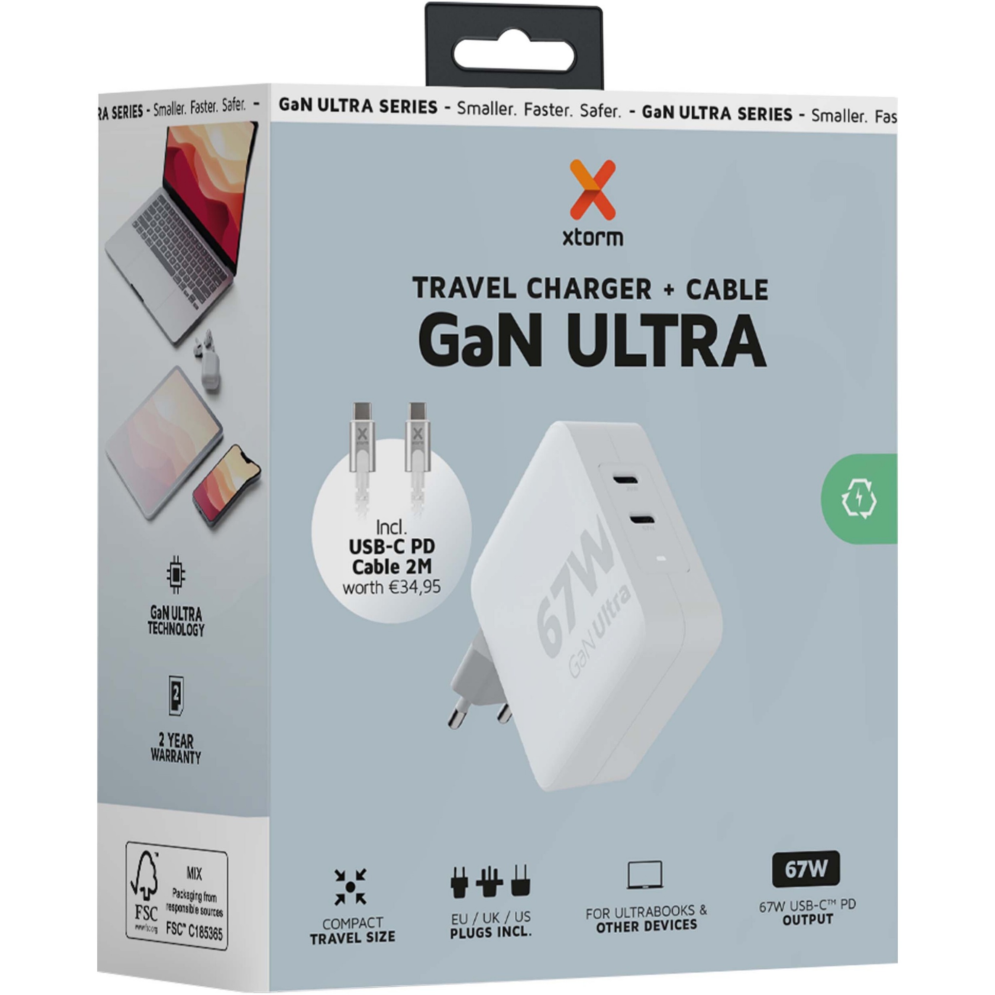 Produkter Små reklamgåvor Xtorm XVC2067 GaN Ultra 67 W reseladdare med 100 W USB-C PD-kabel